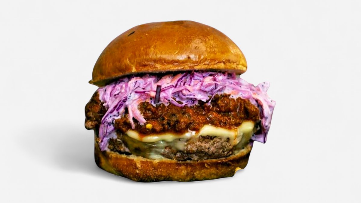 бриош хлебче, сочен 100 % телешки бургер 150г, гауда, чили кон карне сос, колсло салата, лук 390г