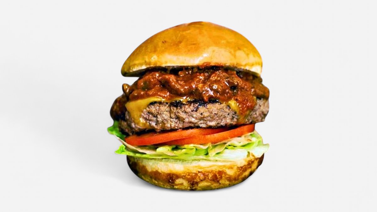 бриош хлебче, сочен 100 % телешки бургер 150г, английски Чедър сирене, чили кон карне сос, айсберг, домат 360г