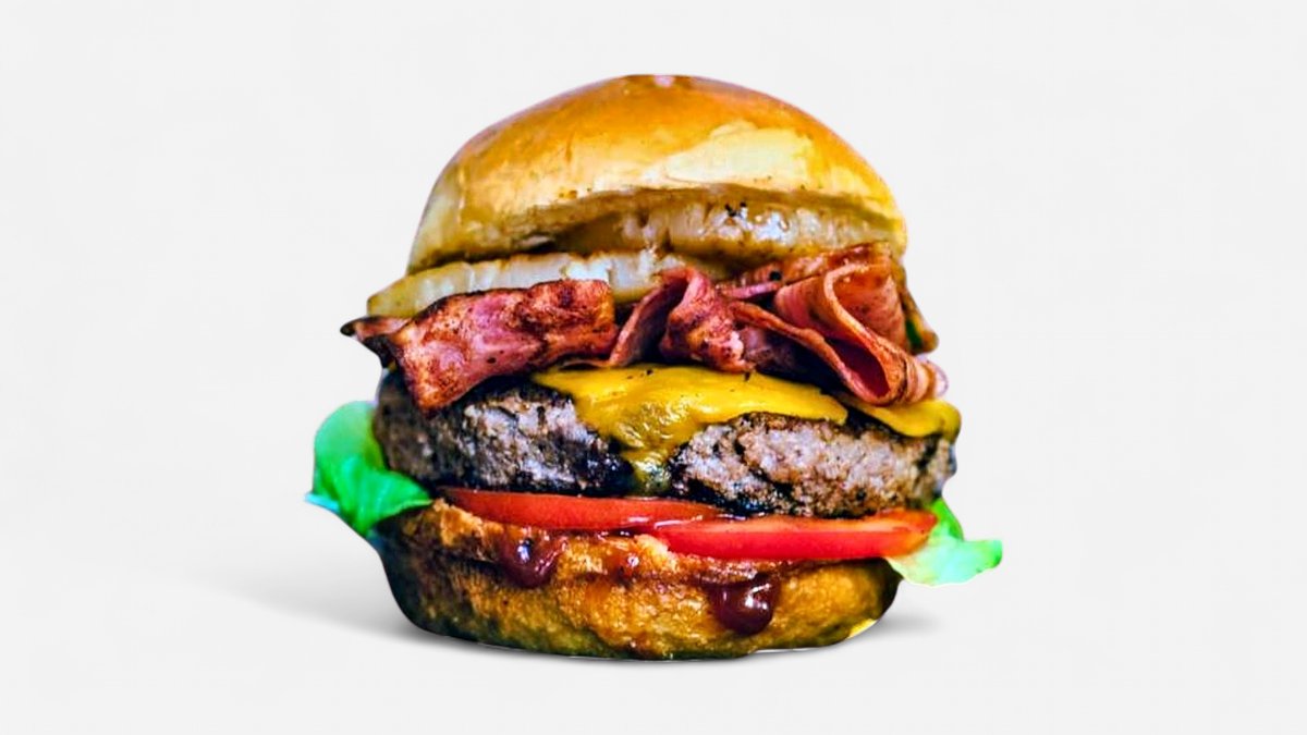 бриош хлебче, сочен 100 % телешки бургер 150г, бекон слайс, английски Чедър сирене, кисели краставички, айсберг, домат, лук, хаус сос 400г