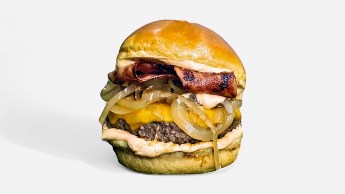 бриош хлебче, сочен 100 % телешки бургер 150г, бекон слайс, английски Чедър сирене, карамелизиран лук, пушен сос 380г
