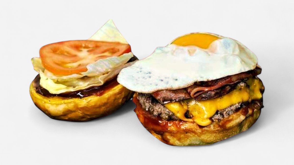 бриош хлебче, сочен 100 % телешки бургер 150г, бекон слайс, английски Чедър сирене, яйце, айсберг, домат, барбекю сос 400г