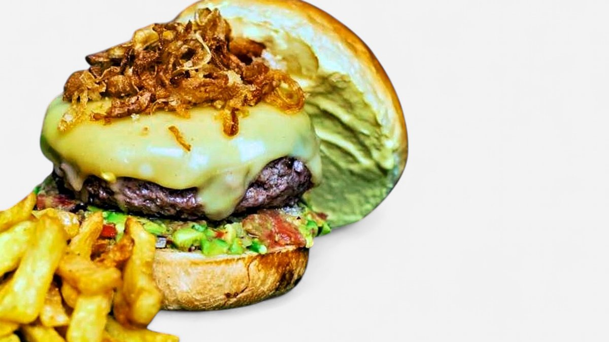 бриош хлебче, сочен 100 % телешки бургер 150г, английски Чедър сирене, авокадо, кисели краставички, бекон слайс 2 броя, гауда, халапеньос, айсберг, домат, лук, айорача сос 480г