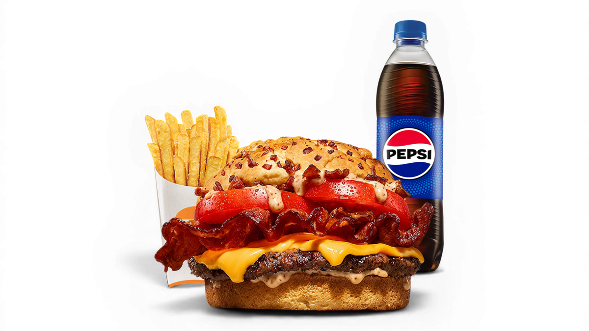 Плътен, пушен вкус, който няма как да се сбърка. Две телешки кюфтета с хрупкав бекон, разтопен чедър, BBQ сос, майонеза, карамелизиран лук, домати и айсберг в солидна 4.5-инчова питка. Истинска наслада по американски. 366г