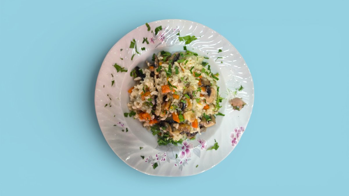 задушени гъби Печурки, лук, ориз, моркови, олио, сол, вода, 300г