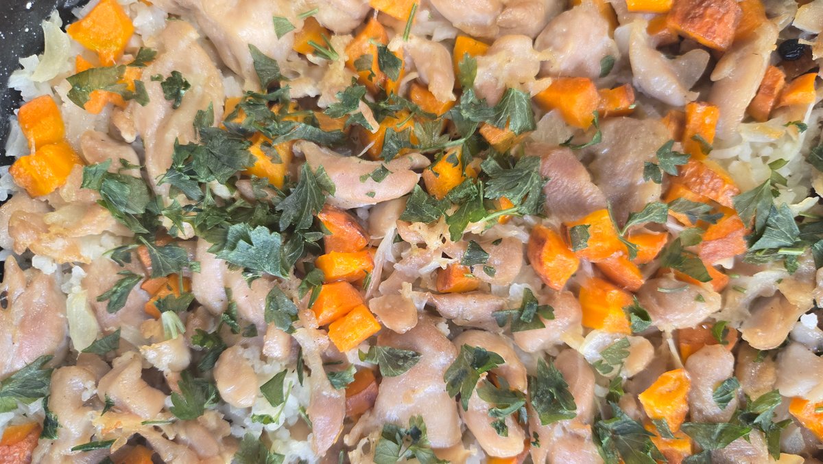 Пилешко месце,лук,морков,черен пипер на зърна,магданоз