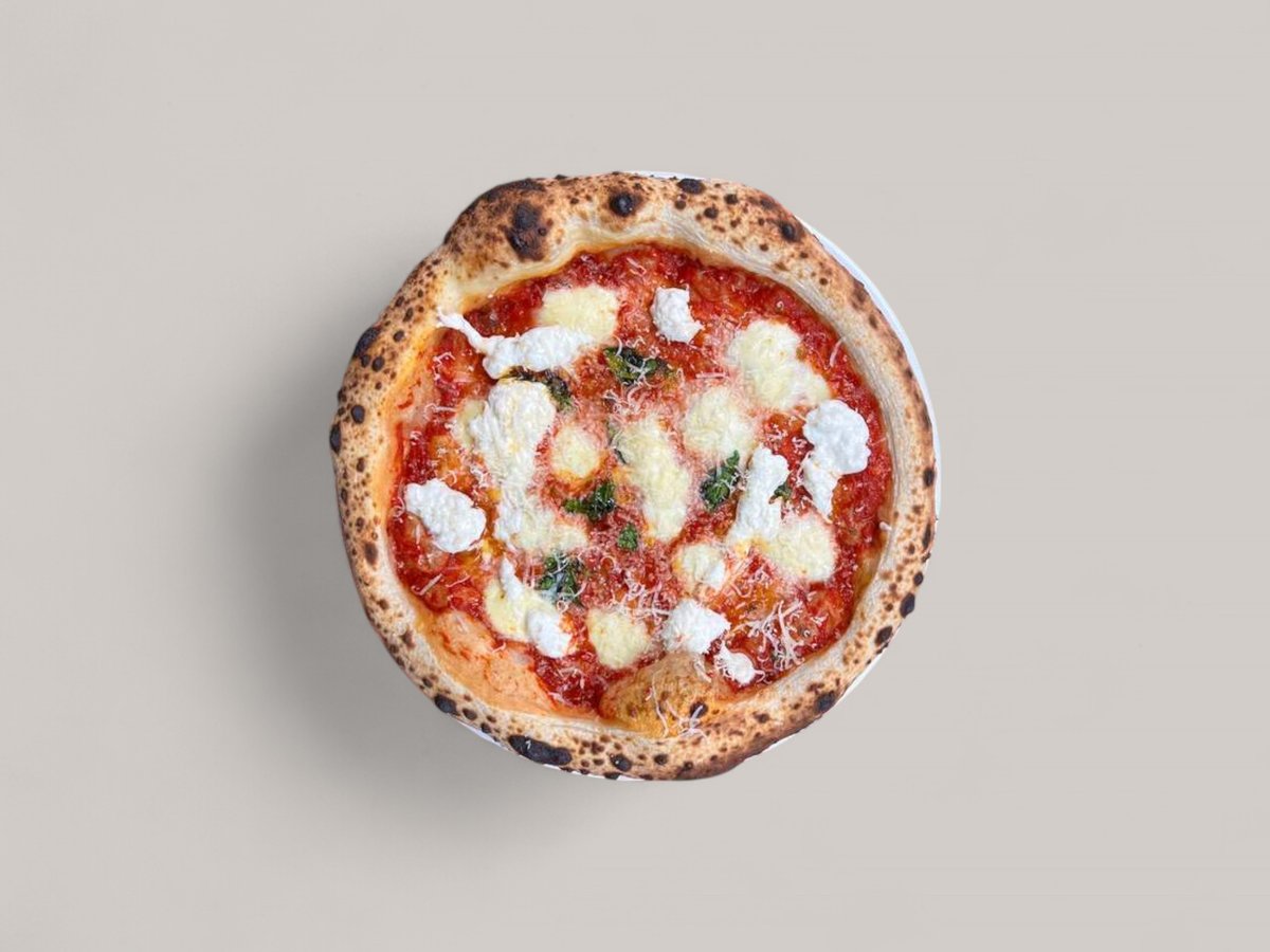 автентично неаполитанско тесто с бавна ферментация и брашно CAPUTO,доматен сос, босилек,скаморца, страчатела,пармезан