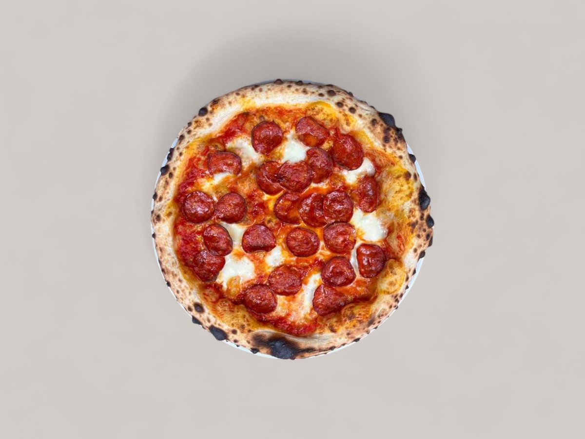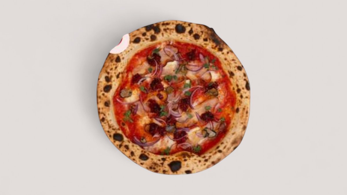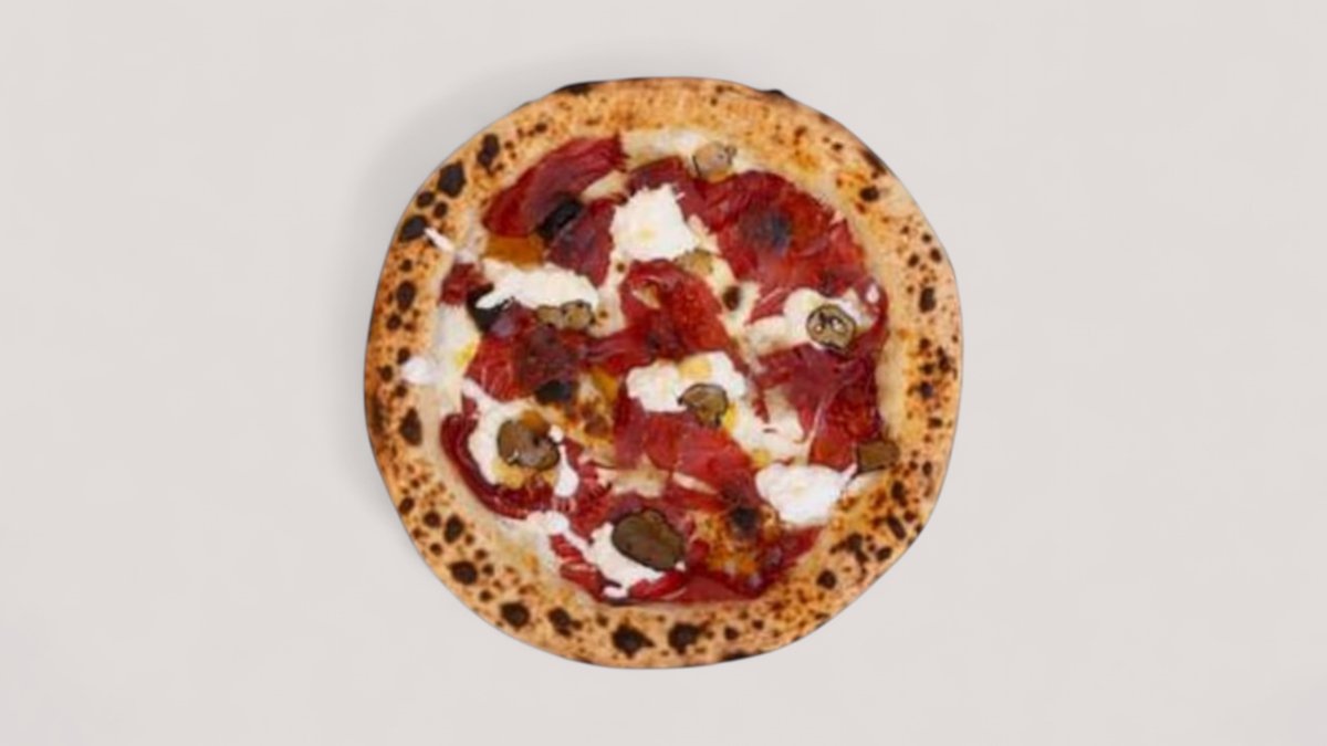 автентично неаполитанско тесто с бавна ферментация и брашно CAPUTO доматен сос, моцарела, панчета,лук,ндуя,риган, маринован трюфел