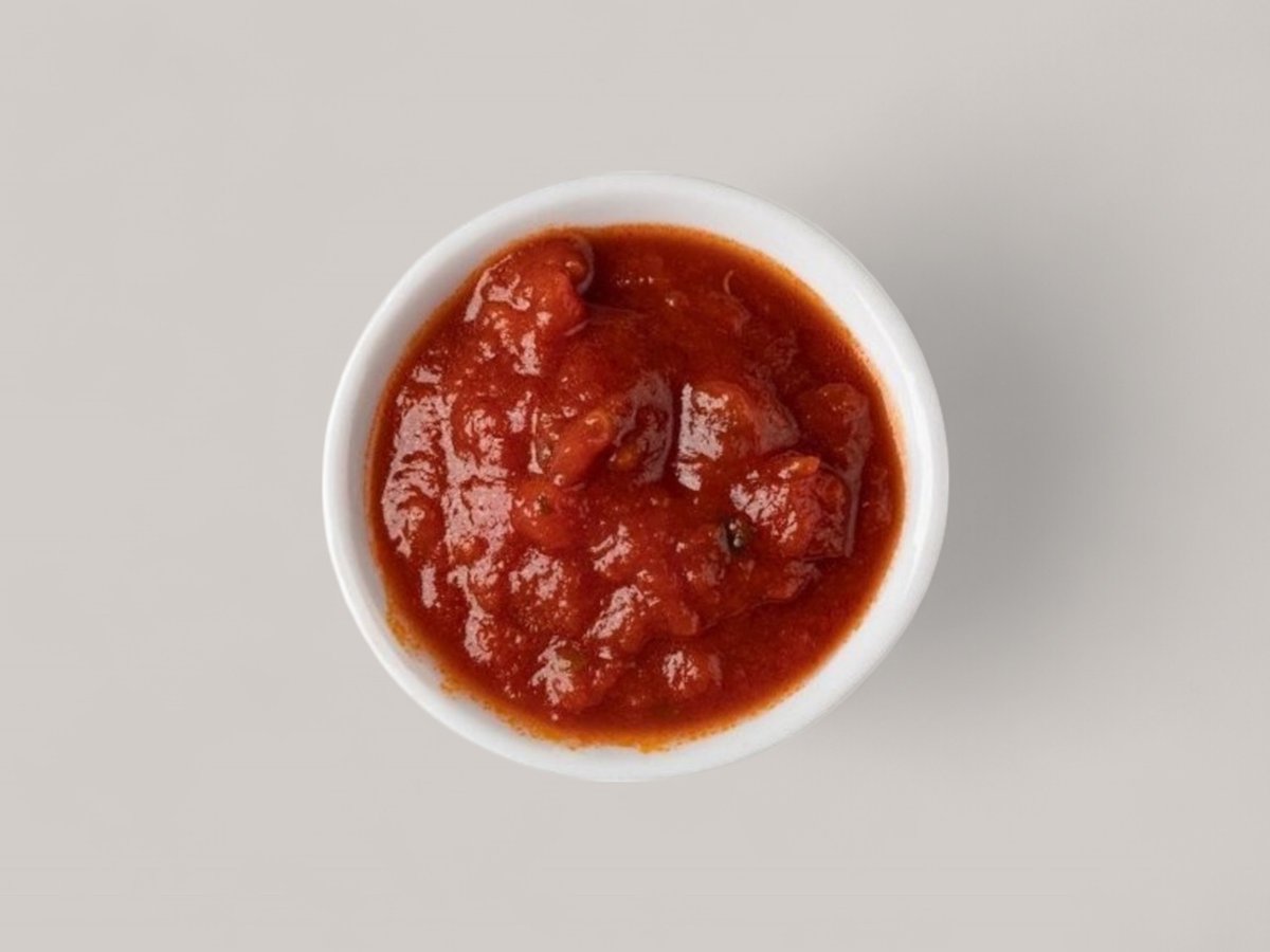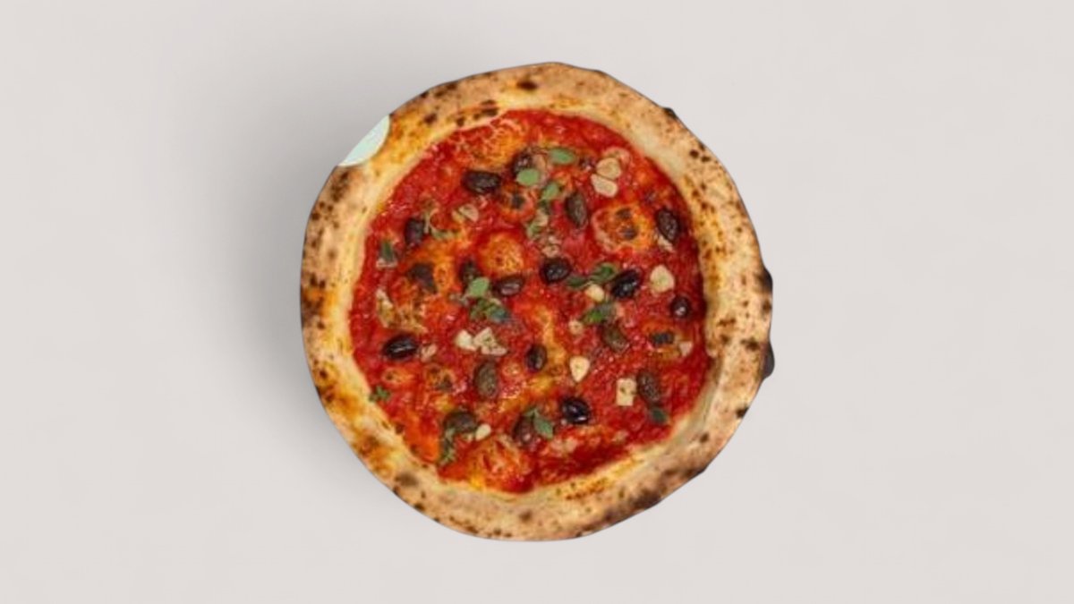 автентично неаполитанско тесто с бавна ферментация и брашно CAPUTO, доматен сос, маринован чесън, маслини и пресен риган