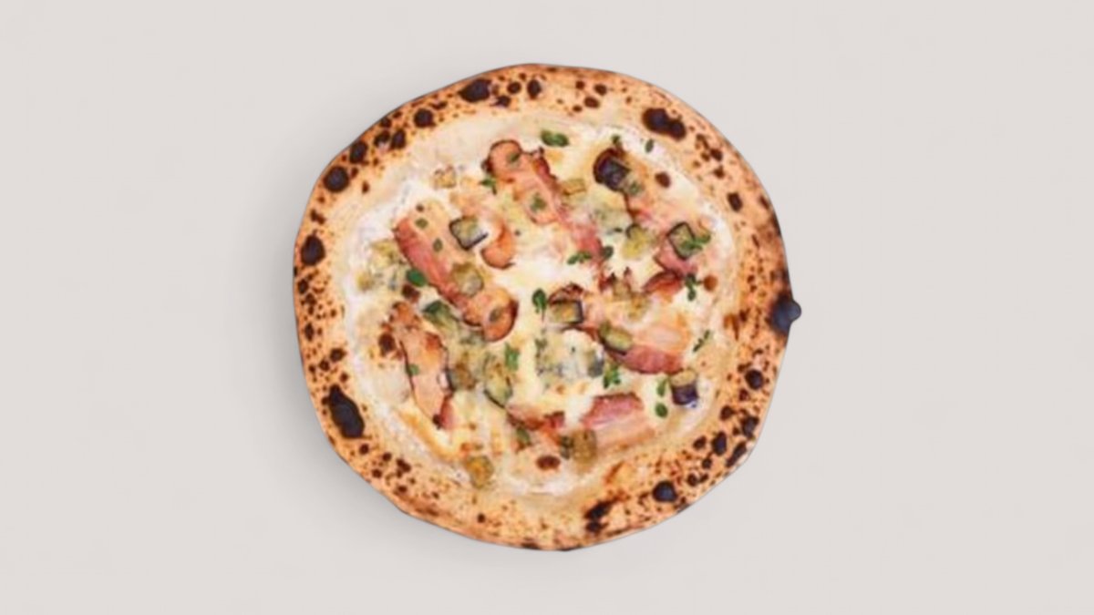 автентично неаполитанско тесто с бавна ферментация и брашно CAPUTO, бяла основа,скаморца,горгонзола ,патладжан, панчета, пармезан, риган