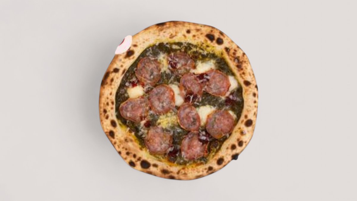 автентично неаполитанско тесто с бавна ферментация и брашно CAPUTO,песто от фриарела, моцарела, с. наполи,ндуя ,пармезан