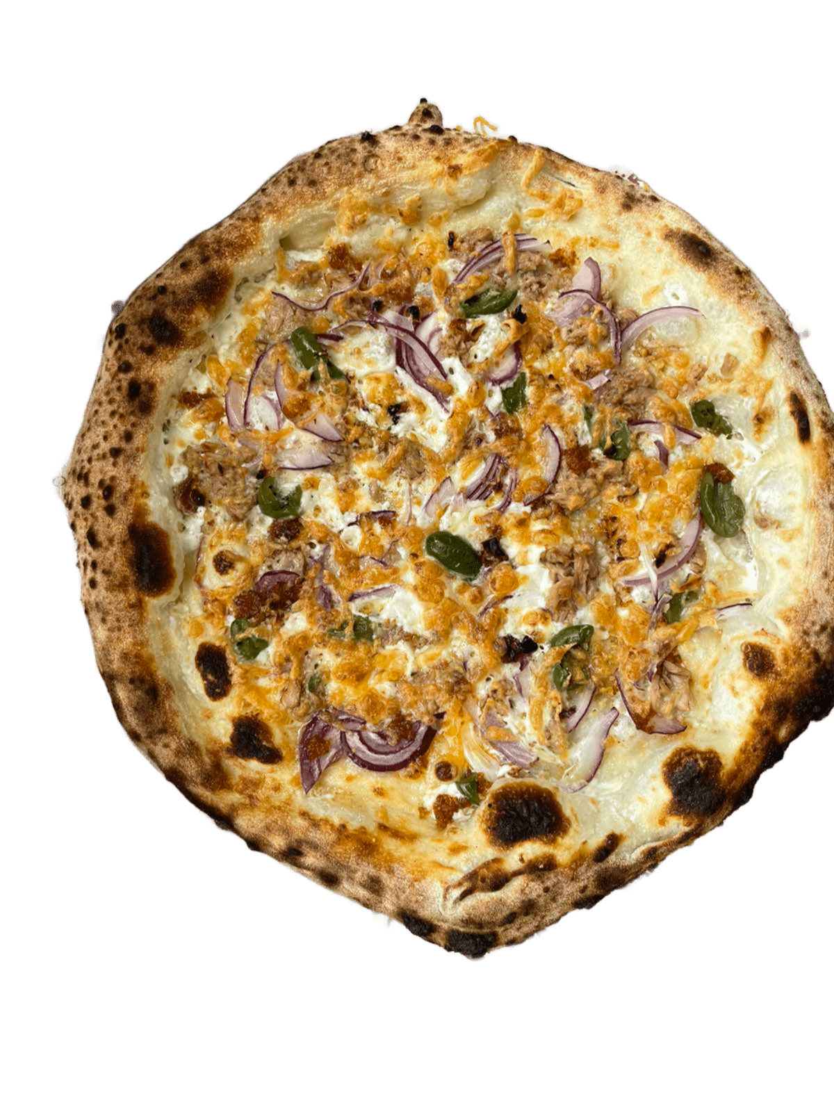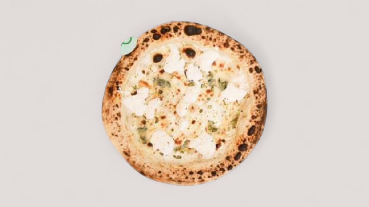 автентично неаполитанско тесто с бавна ферментация и брашно CAPUTO, бяла основа, скаморца, горгонзола след изпичане страчатела и натрошено пистачио