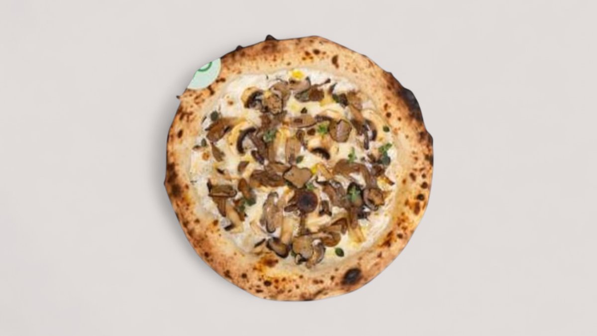 автентично неаполитанско тесто с бавна ферментация и брашно CAPUTO, бяла основа, печурки,горски гъби след изпичане прясна мащерка и маринован трюфел