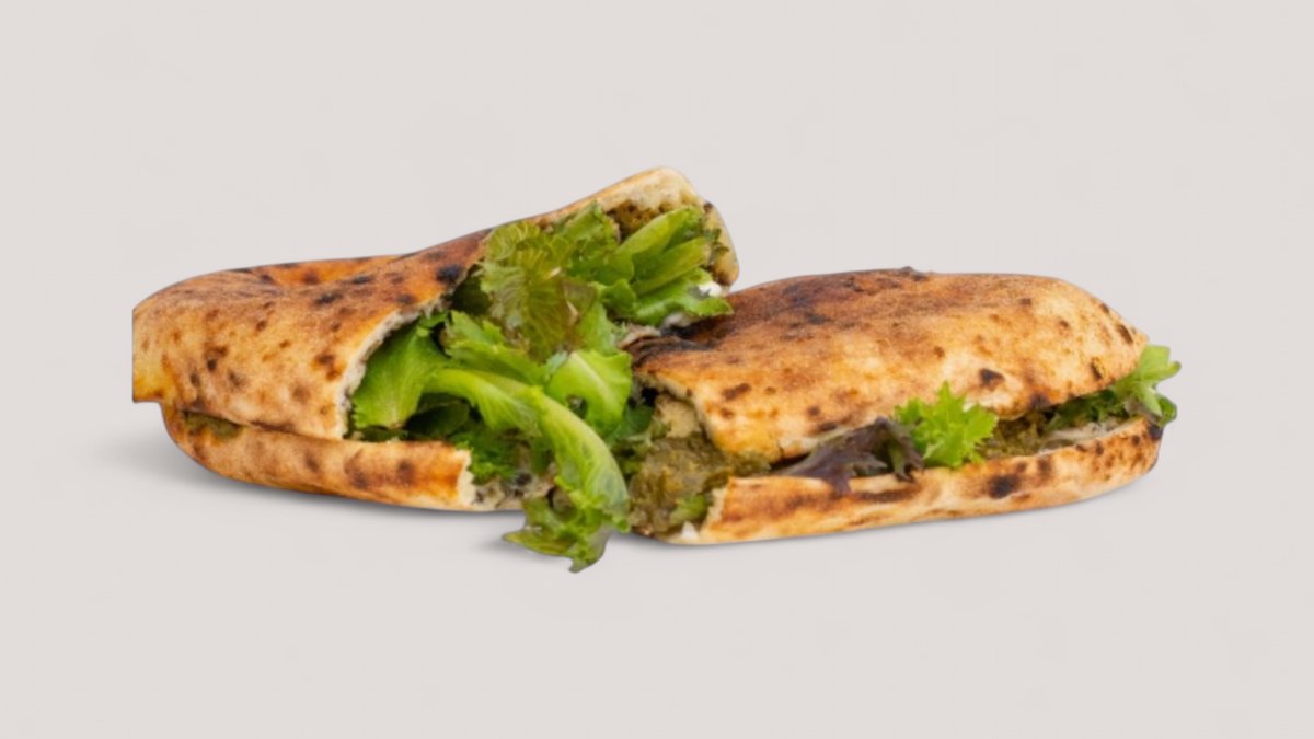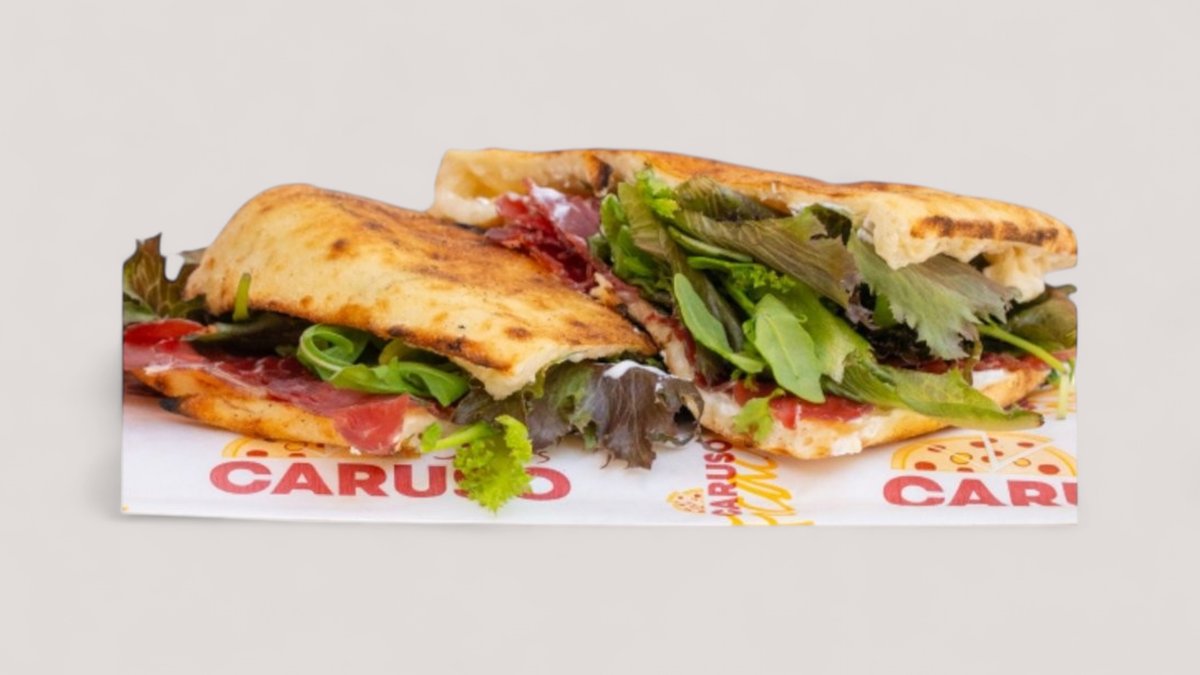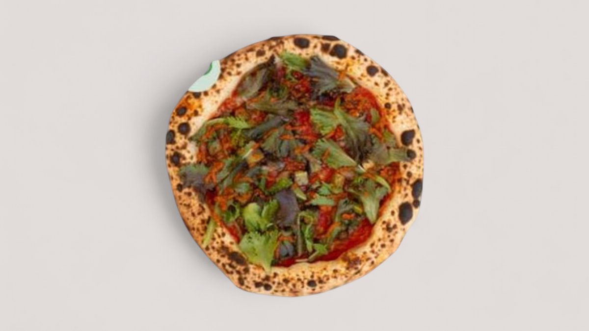 автентично неаполитанско тесто с бавна ферментация и брашно CAPUTO,доматен сос,изпечен патладжан,горски гъби, домашно песто от сушен домат и микс свежи салати