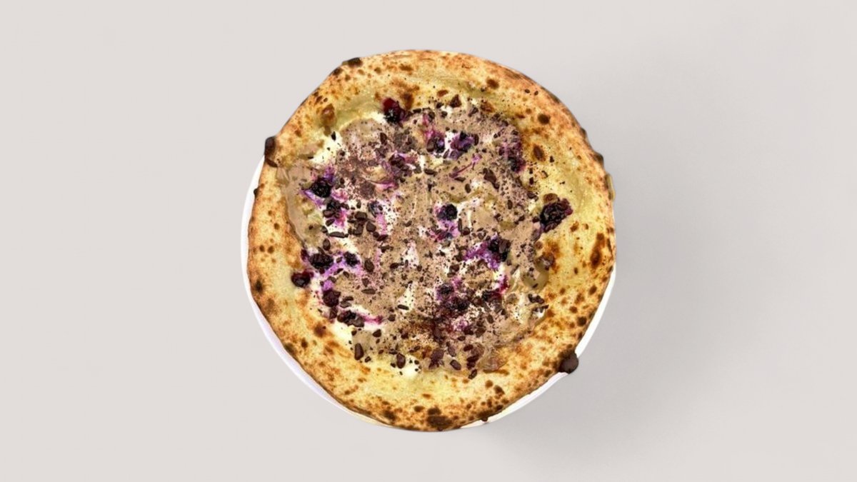 автентично неаполитанско тесто с бавна ферментация и брашно CAPUTO, бяла основа, скаморца, горгонзола след изпичане страчатела и натрошено пистачио