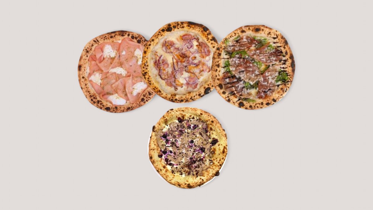 автентично неаполитанско тесто с бавна ферментация и брашно CAPUTO, бяла основа,скаморца,горгонзола ,патладжан, панчета, пармезан, риган