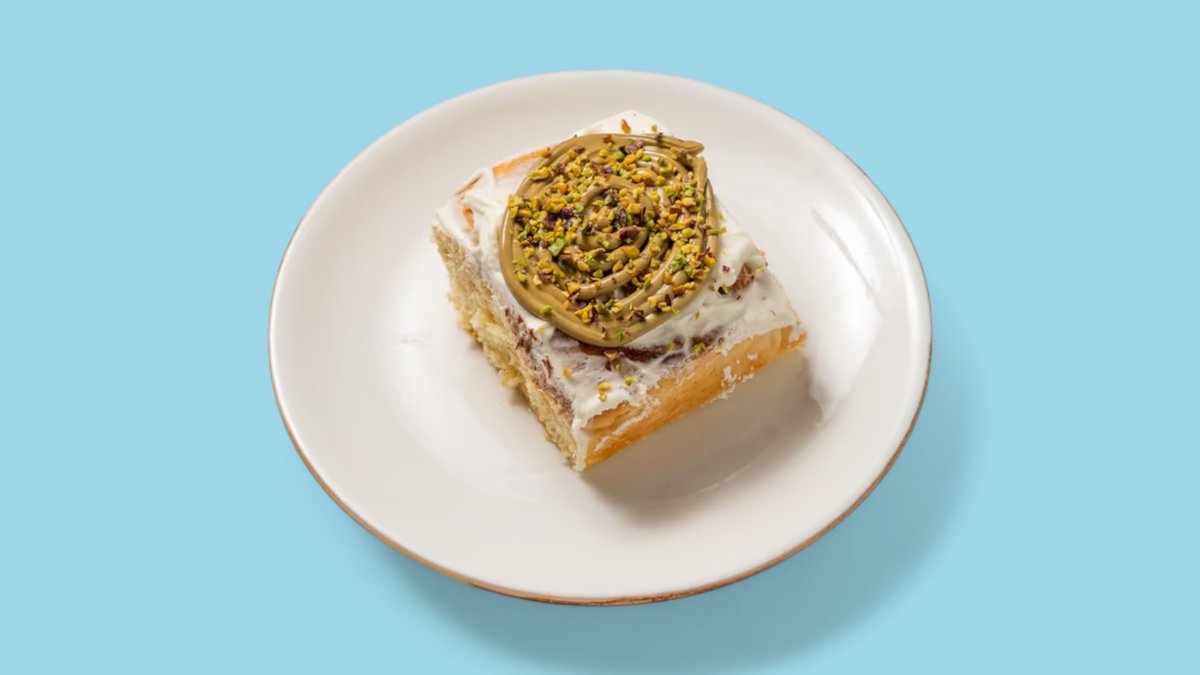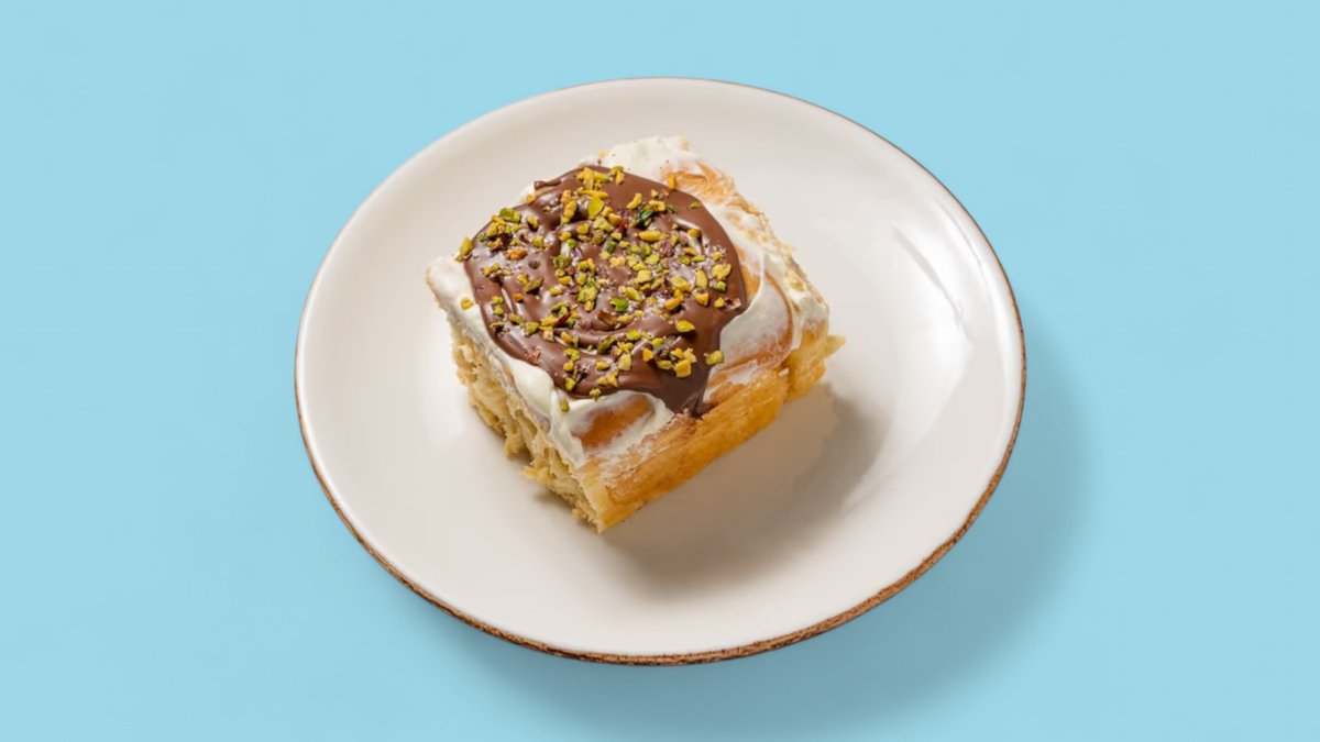 Канелено руло с маскарпоне, кадаиф, крем шам фъстък и течен шоколад