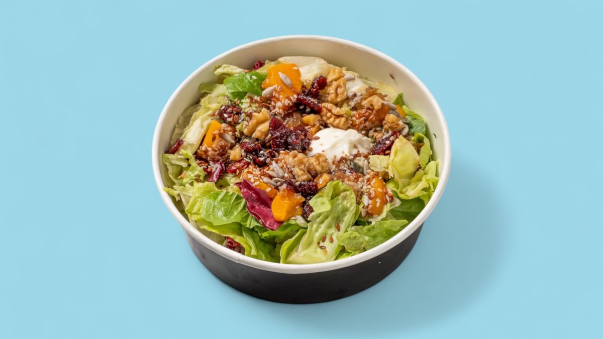Бурата, салата миста, микс семена, белена праскова, сушени боровинки, орехи, мустарда