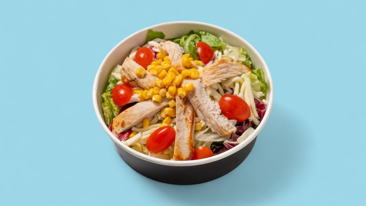 Зелена салата, салата миста, изпечено пилешко филе, чери домати, моцарела жулиен, царевица