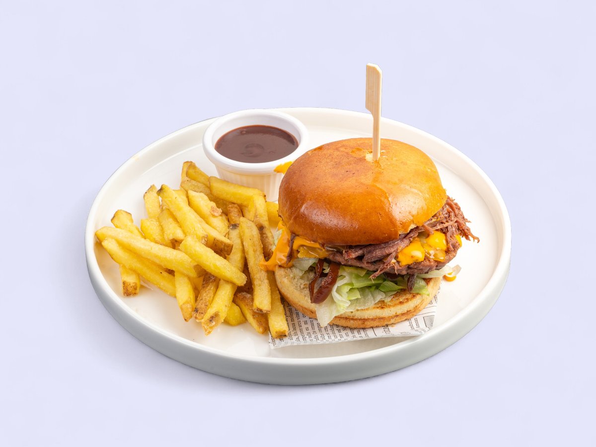 дърпано телешко месо, Чедър, карамерлизиран лук, айсберг, домат, кисели краставички, ВВQ сос и пържени картофи