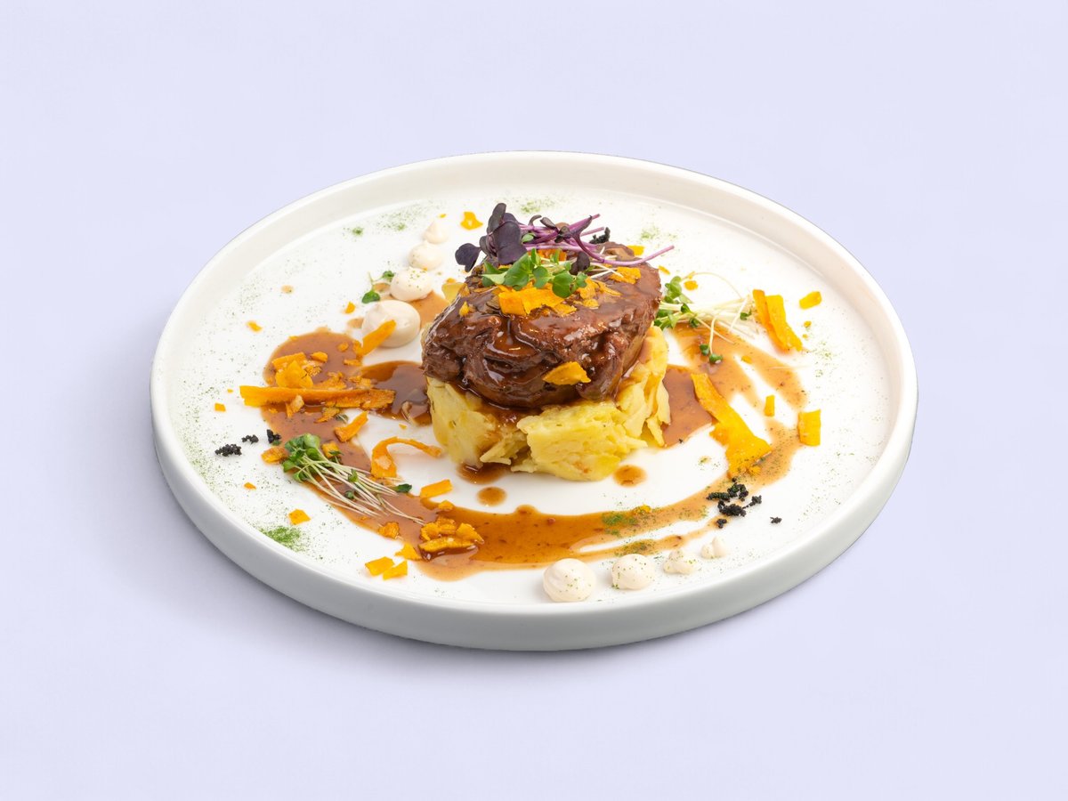глазирано с шипков мармалад, мачкан билков картоф, трюфел майонеза, печен сос и чипс от моркови