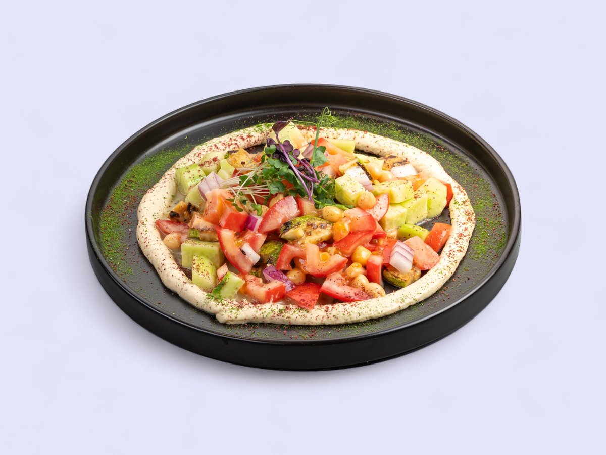 домати, краставици, гриловани тиквички, хумус нахут, сумах, червен лук, авокадо и лимонов дресинг
