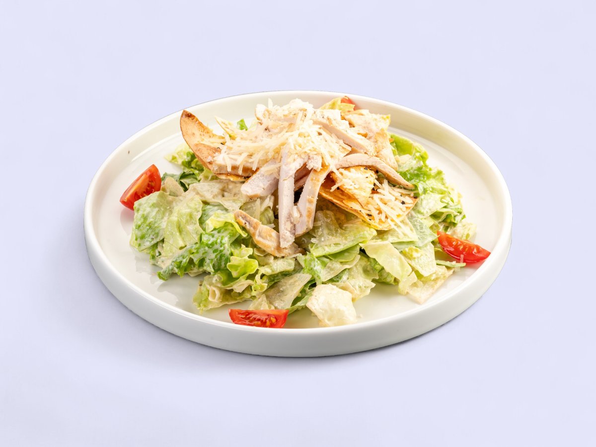 класически цезар по автентична рецепта, с вкусно мариновано гриловано пилешко филе, айсберг, лаваш, пармезан