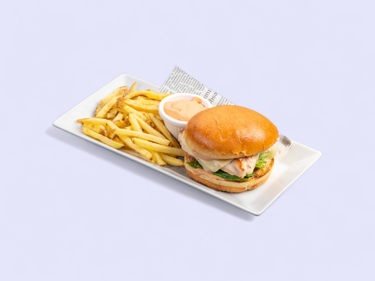 панирано пилешко месо, Чедър, карамелизиран от лук листни салати, домат, кисела краставичка, американски бургер сос и пържени картофи