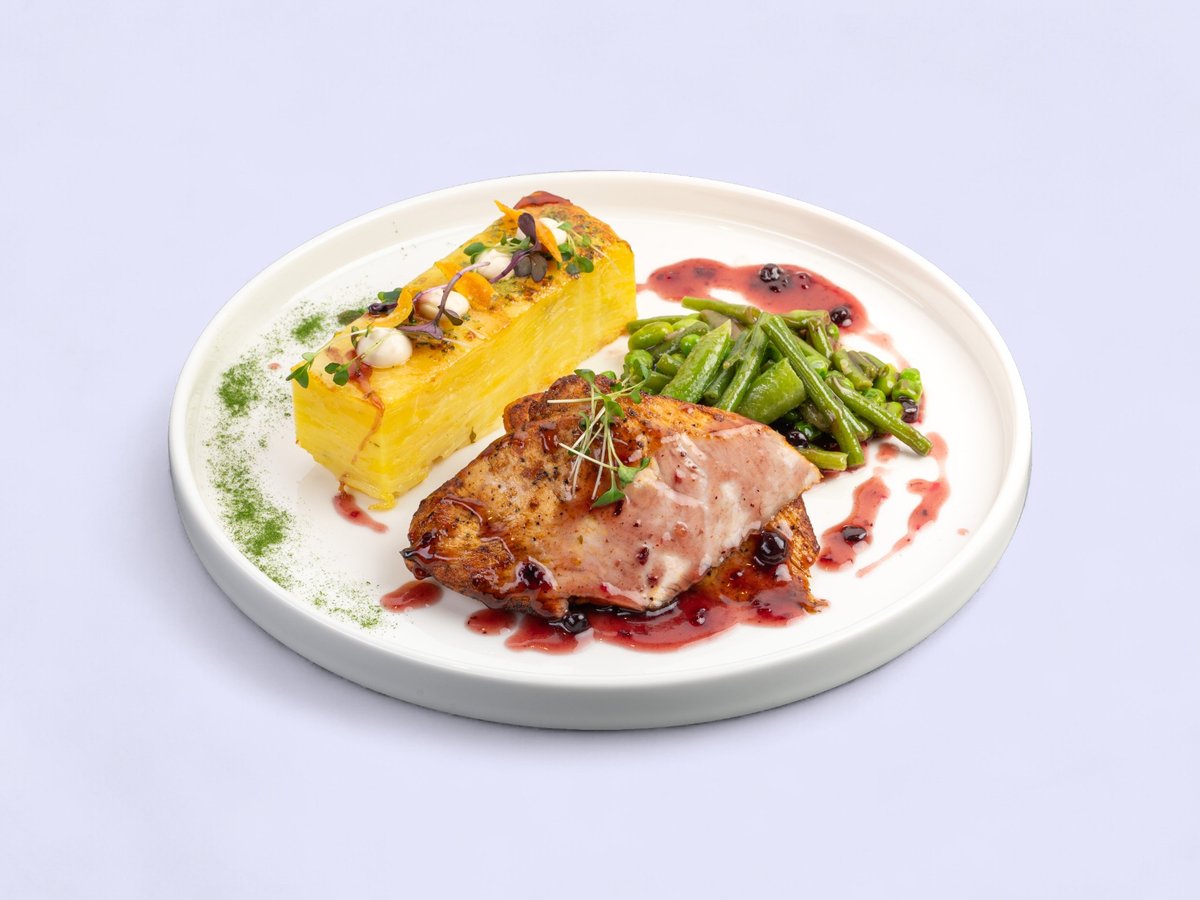 гарниран с картофен терин, микс от млечен грах, зелен боб и едамаме, боровинков сос
