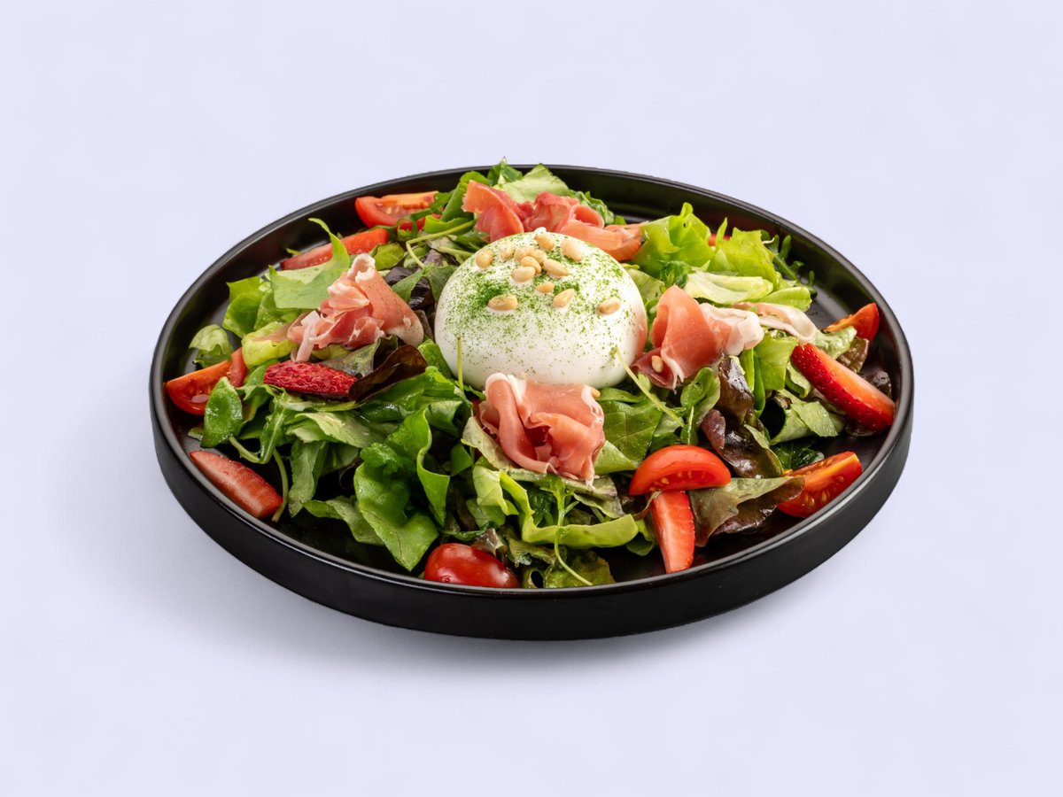 микс листни салати зелена, червена, рукола, цяла топка бурата 125г., прошуто Крудо, чери домати, ягоди, кедрови ядки, малинов дрениснг и балсамова редукция