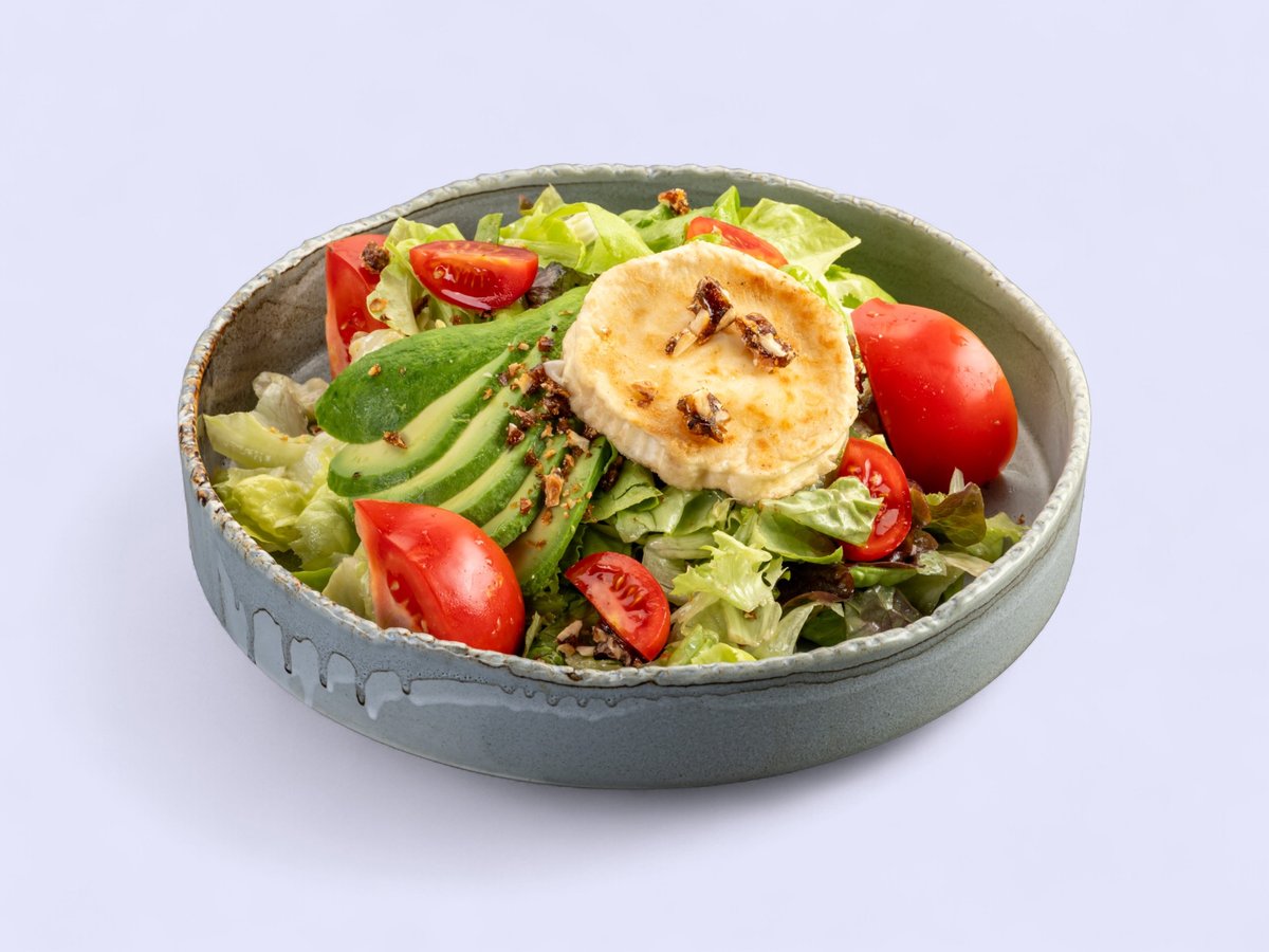 микс от листи салати, козе сирене, домати, чери домати, авокадо, лимонов дресинг, орехов крокан