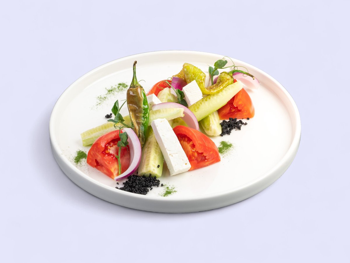 домат, краставица, пържена сиврия, люта чушка, лук дехидратирани маслини, прах от магданоз, овче сирене