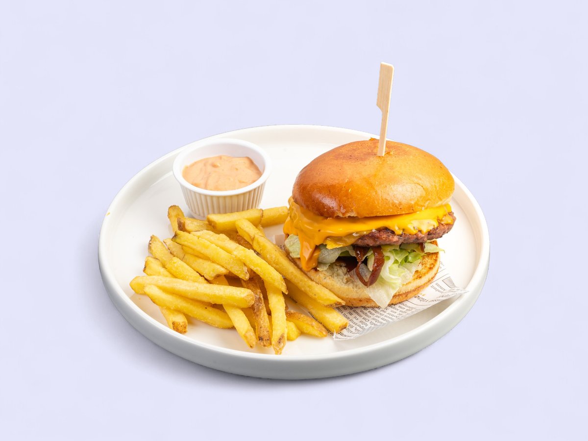 бургер от говеждо месо, Чедър, мармалад от лук, листни салати, домат, кисела краставичка, американски бургер сос и паржени картофи