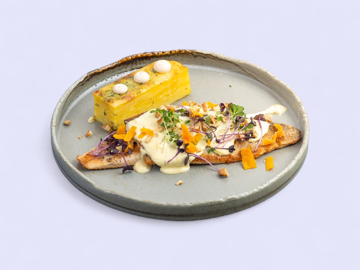поднесена с картофен терин, ароматен сос и орехи