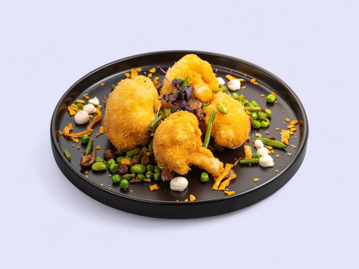 поднесен със микс от млечен грах, зелен боб и едамаме, и чипс от морков