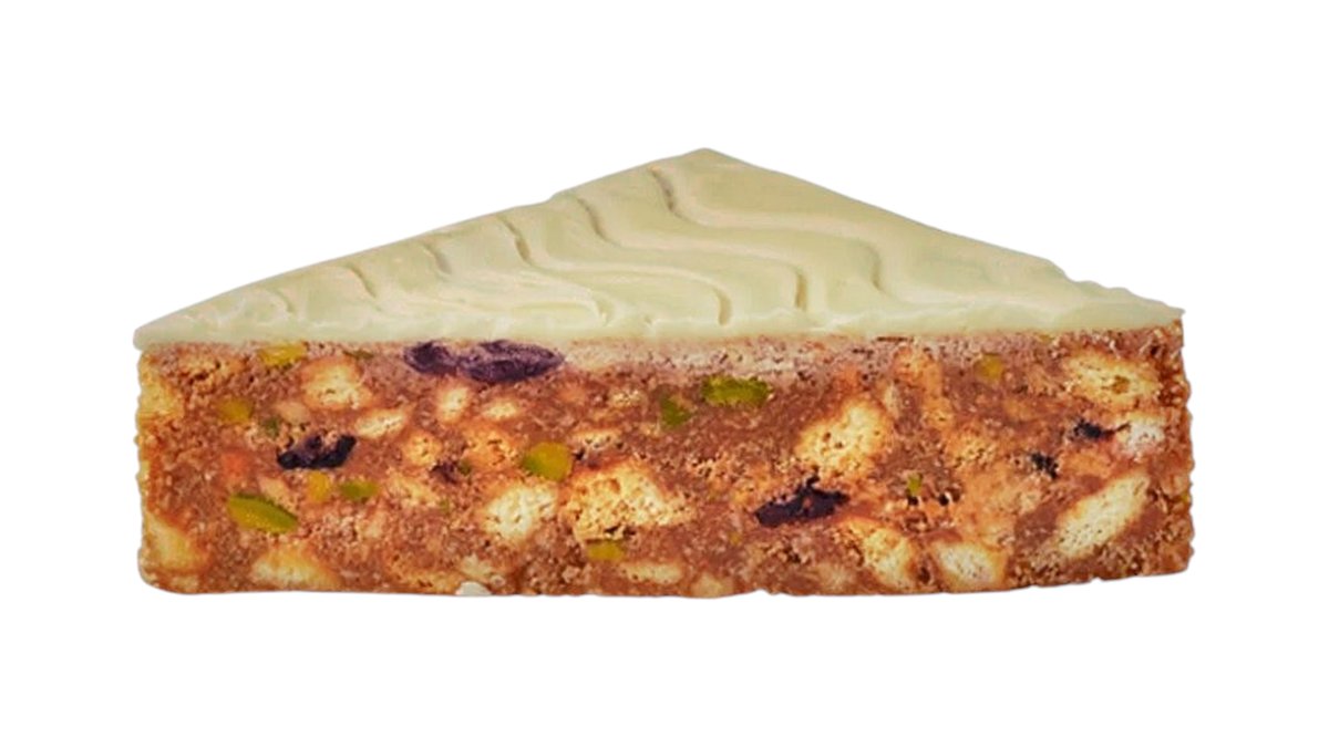 Тифин с бисквитена основа, бял белгийски шоколад с подсладители, червени боровинки и шамфъстък и заливка бял шоколад 90г