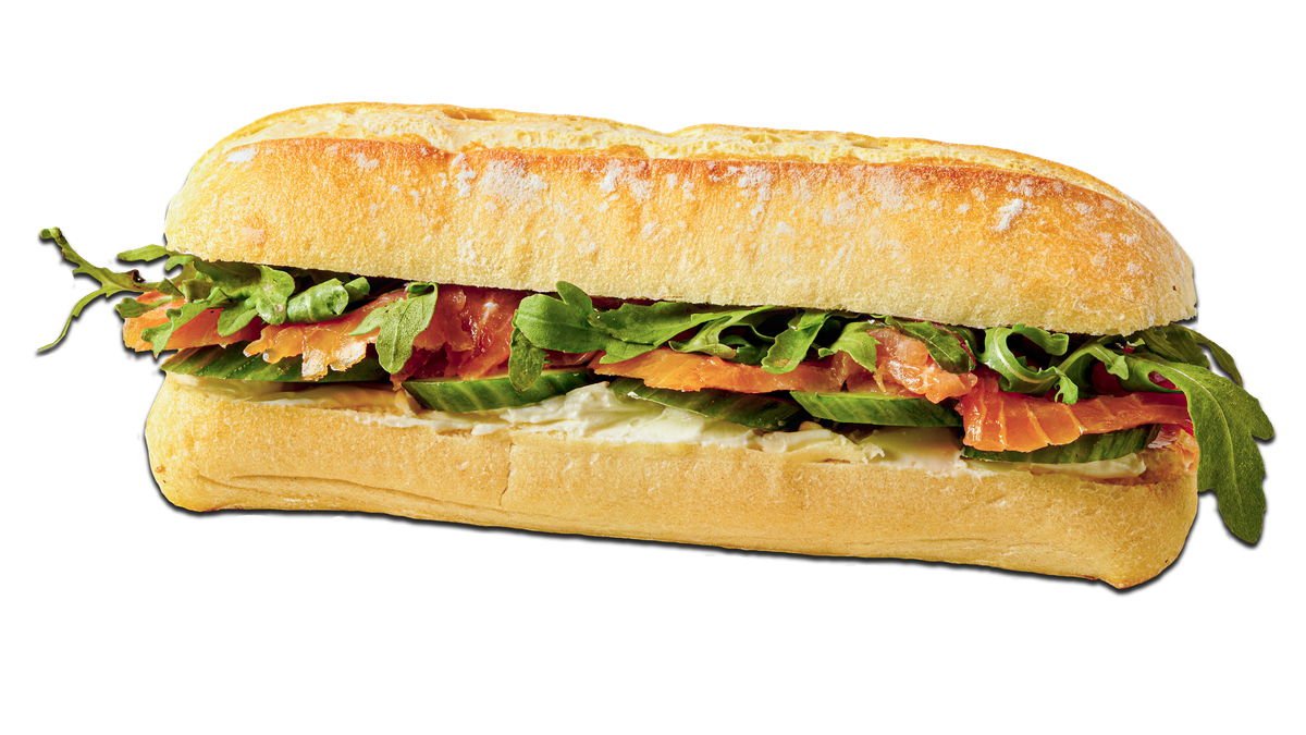 Мек френски хляб, пушена сьомга, краставица, крема сирене и свежа рукола 225г