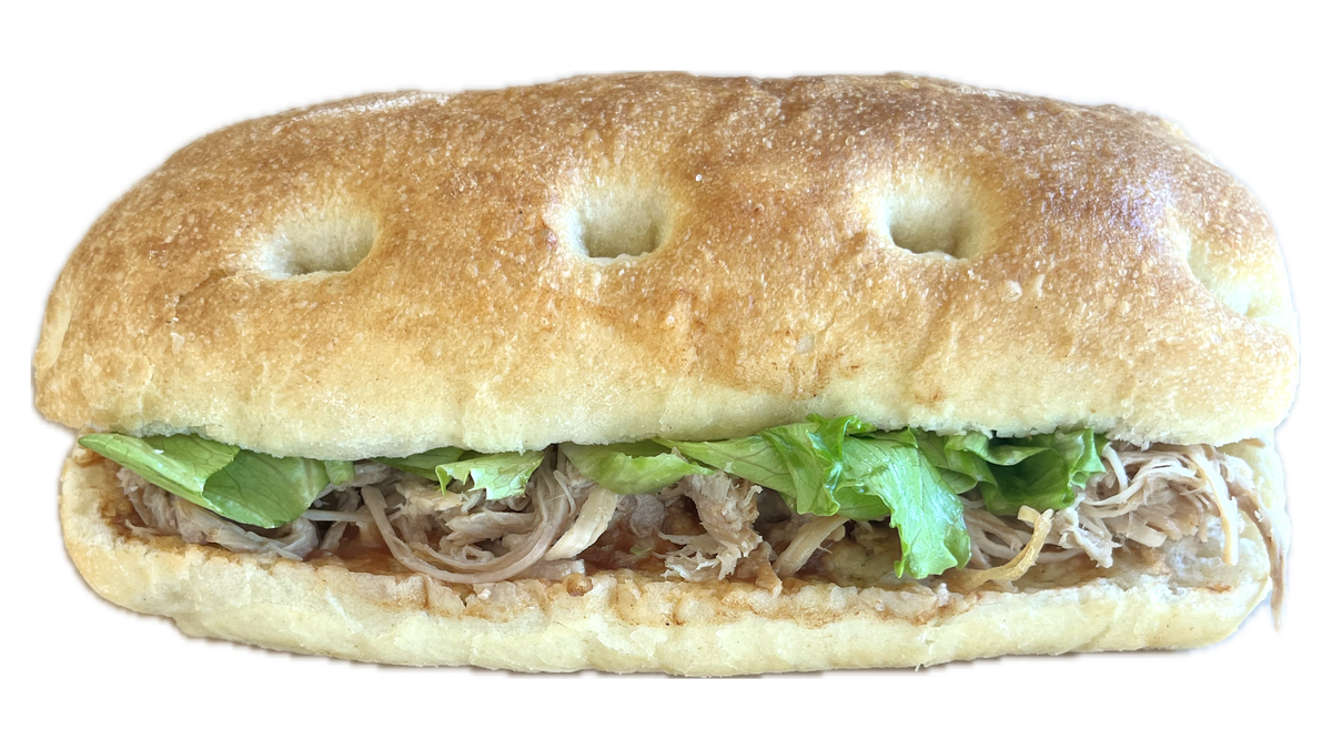 Дърпано свинско в италианско хлебче Романа, сос барбекю и хрупкав лук 195г