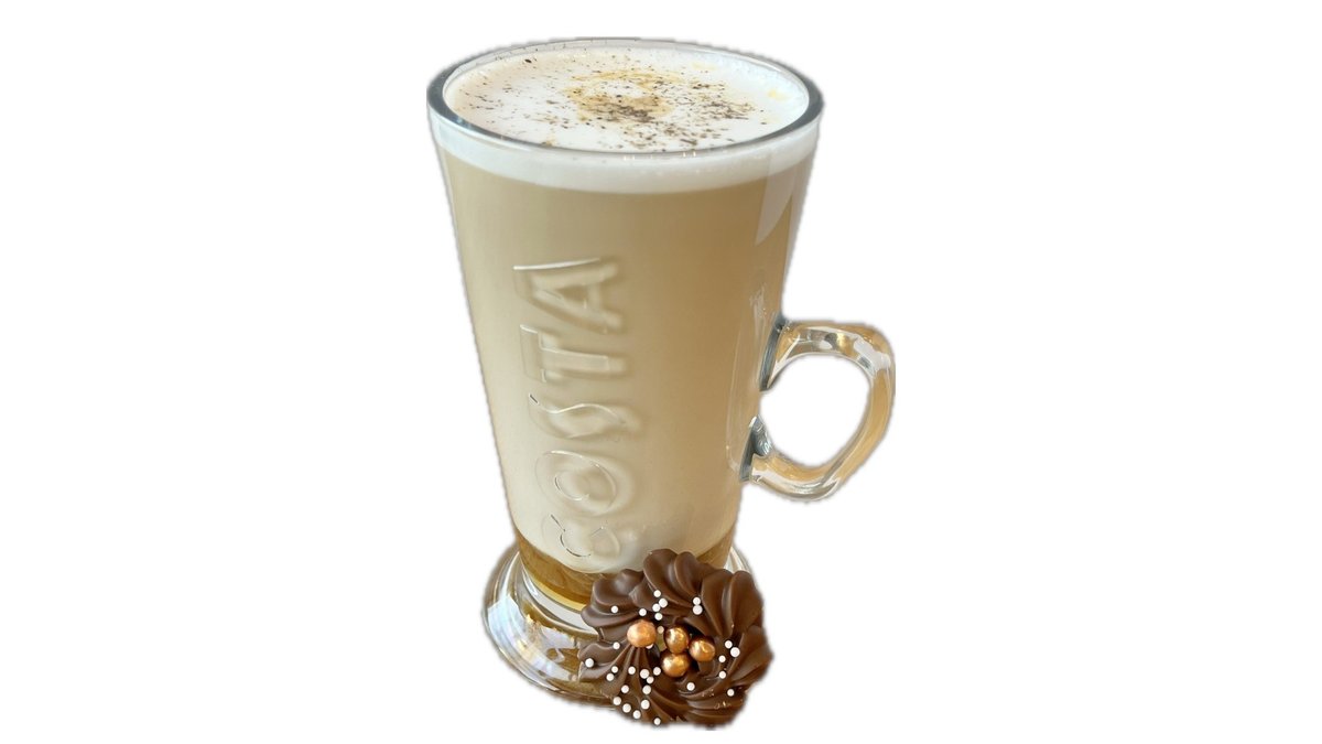 Празнично деликатно лате с вкус на ябълков пай, карамелени нотки и букет от коледни аромати. Декорация от коледен венец от белгийски шоколад.