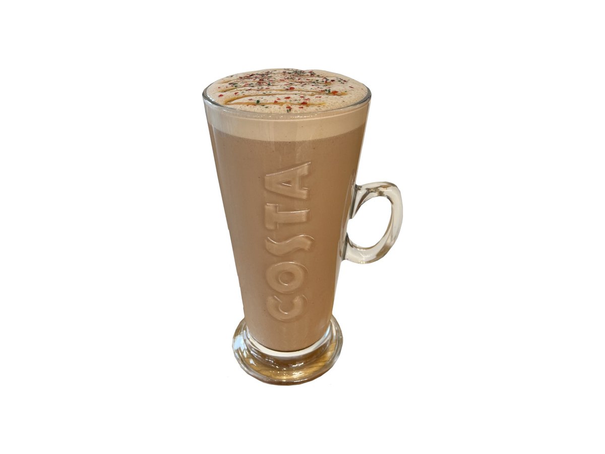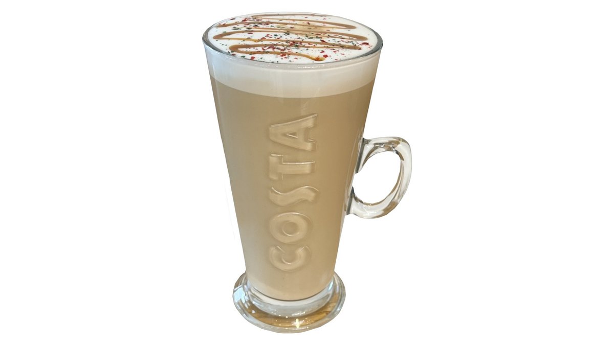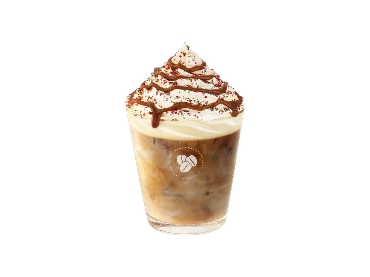 Аромати на лешници и карамел се срещат за ледено изживяване в лате с цветна поръска и карамелен сос топинг.