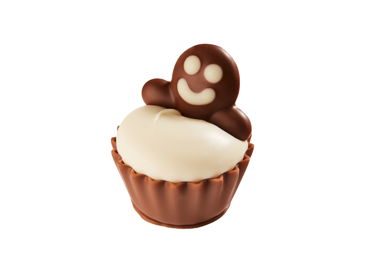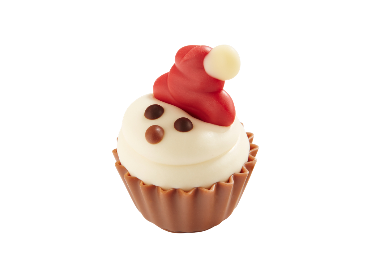 Мини къпкейк от декориран млечен шоколад с пълнеж от лешников пралин и шоколадов крем. 20г