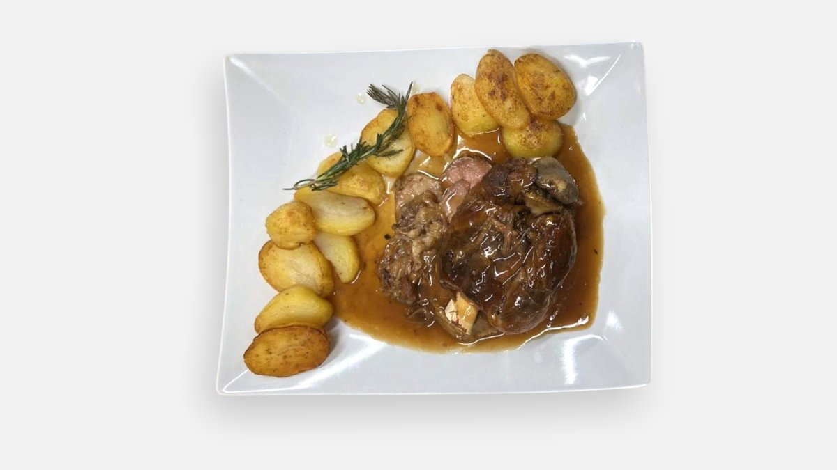 свински джолан с кост, печен сос, печени картофи с розмарин и чесън 800г