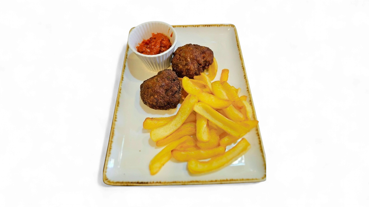 Селски пържени кюфтенца с пържени картофи и лютеница