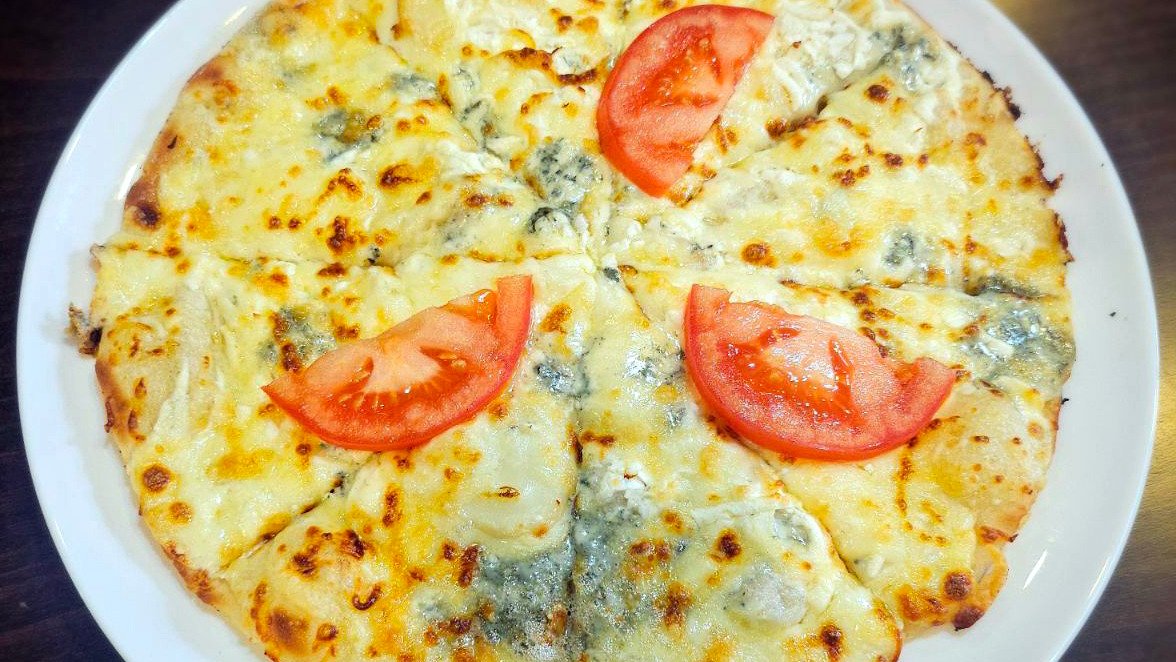 сметана,моцарела, сирене, синьо сирене, топено сирене, пресен домат 28 см.