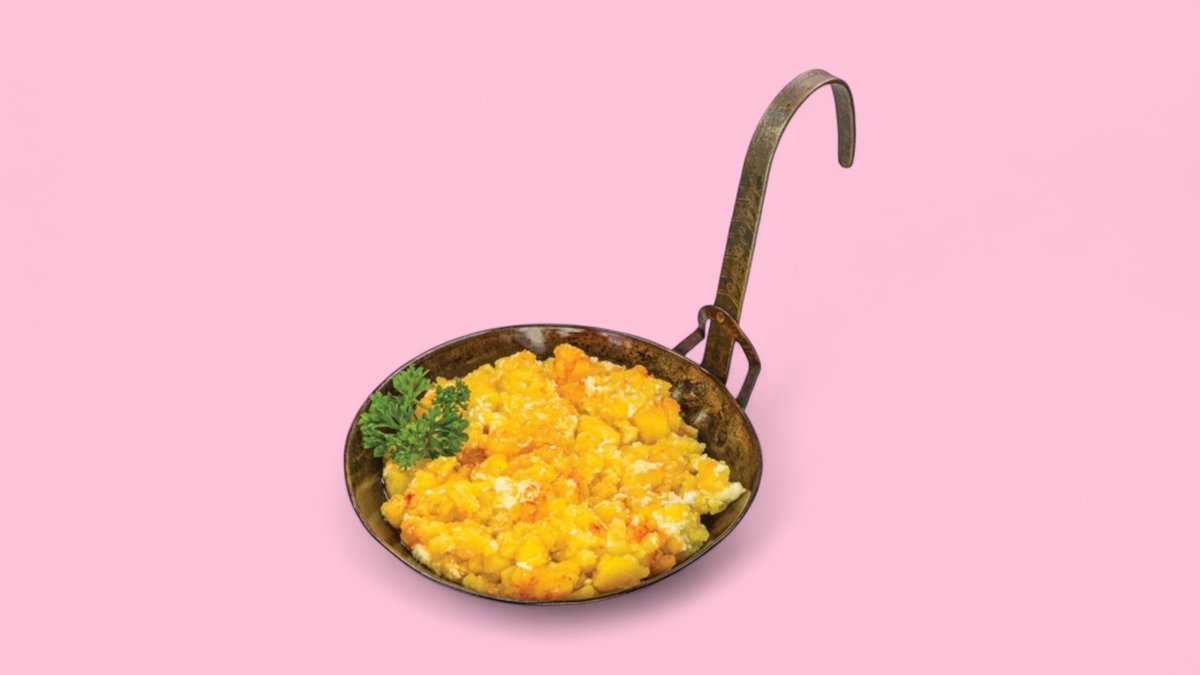 варени картофи, яйце, краве сирене, кашкавал, кисели краставички, млечен сос 350г