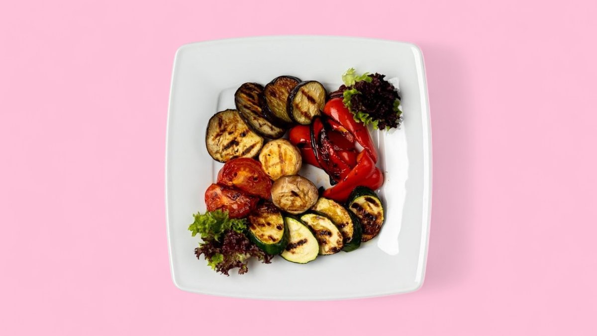патладжан, тиквичка, домати, краве сирене, медено-горчичен дресинг 350г