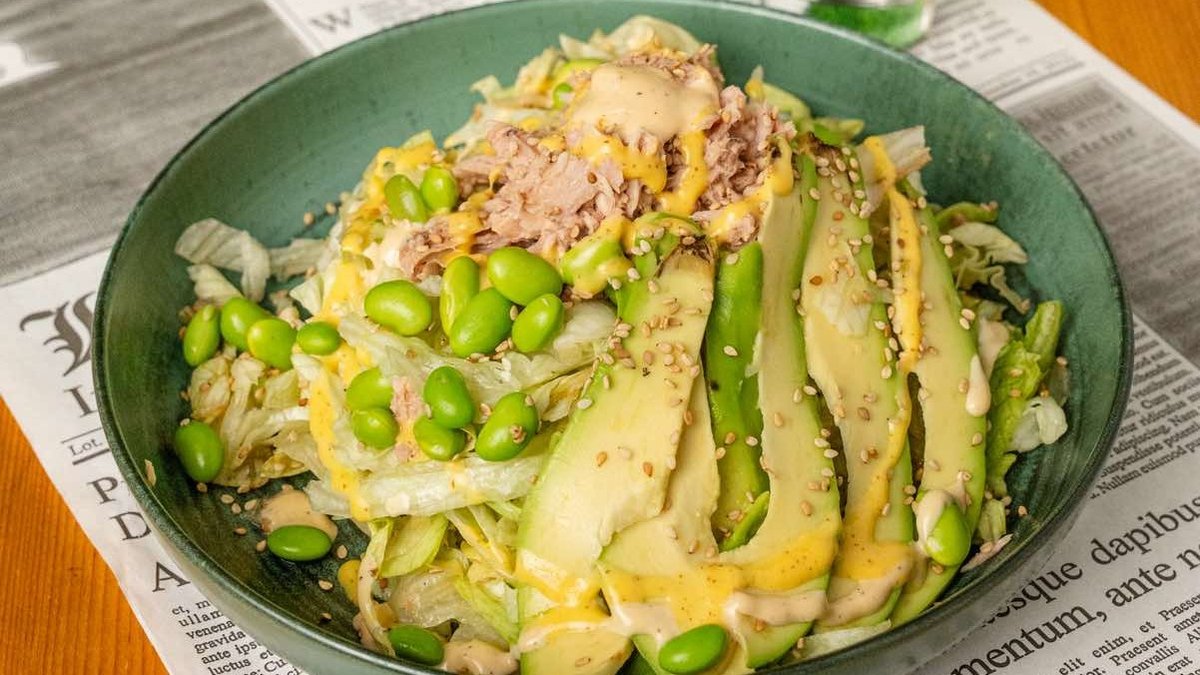риба тон и авокадо, едамаме, сусам, медено-горчичен дресинг 350г