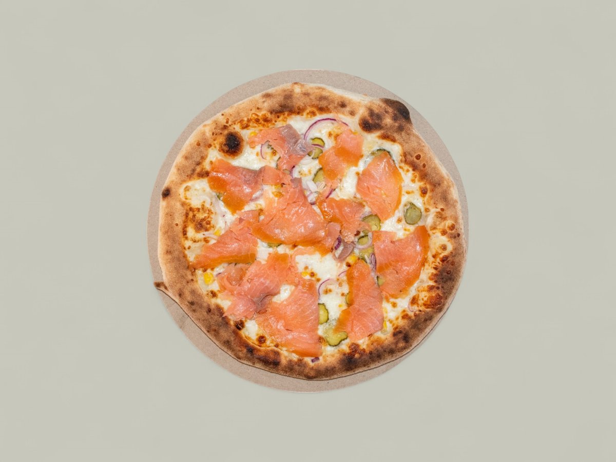 доматен сос, сметана, моцарела, студено пушена сьомга, лук, царевица, кисели краставички