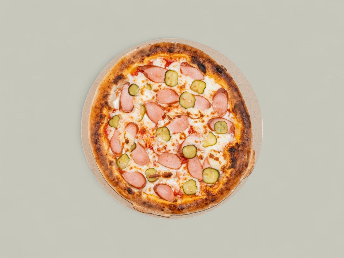 доматен сос, моцарела, кренвирши, топопено сирене, кисели краставички, чубрица