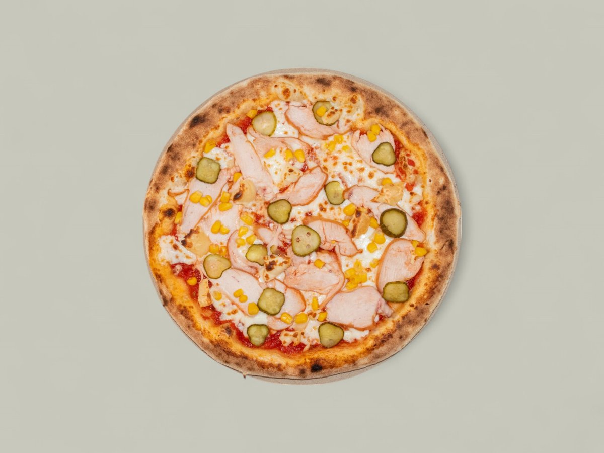 доматен сос, пушено пилешко филе, топено сирене, царевица, кисели краставички 30см