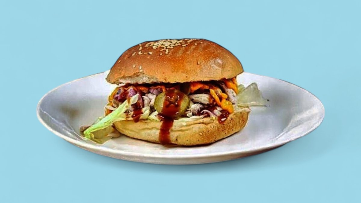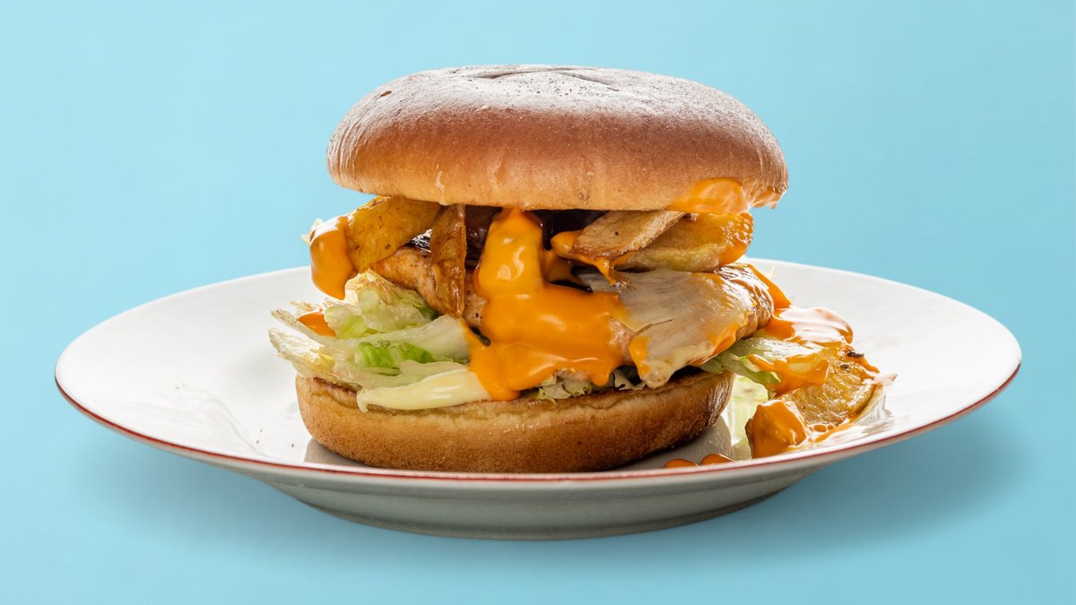 Телешки бургер, чедър, пикантна салата, майонеза, айсберг, бургер сос Мисисипи